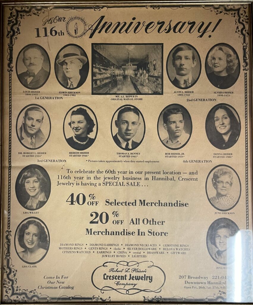 It all started when R.E. Lackner opened a jewelry, camera, and general mercantile store in Hannibal. Together with his daughter’s husband, Louis Heiser, R.E. Lackner started Heiser Jewelry Company.